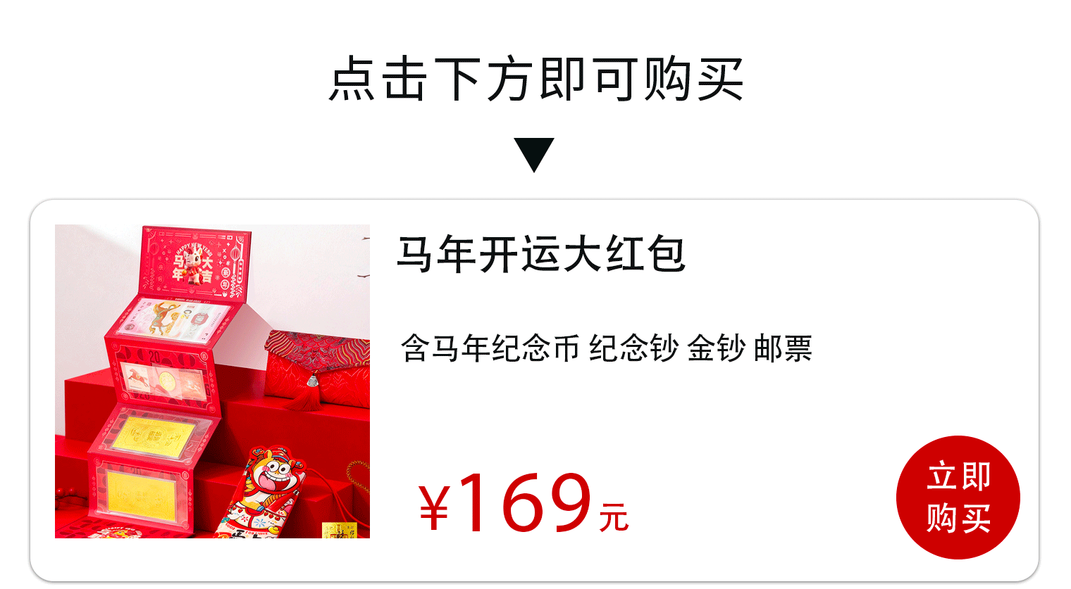 在这样一个年份,仅需169元即可集齐这套炙手可热的纪念钞、纪念币和生肖邮票的「马年大红包」,无论是自己收藏还是送给亲朋好友,都有喜庆吉祥的好兆头!